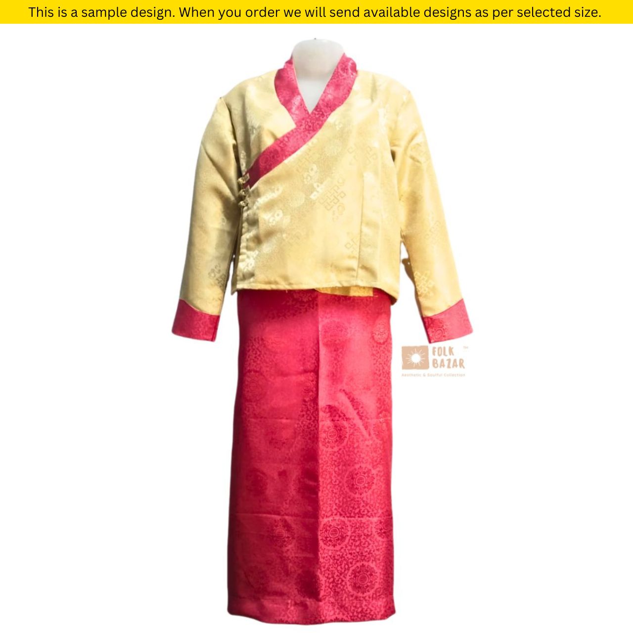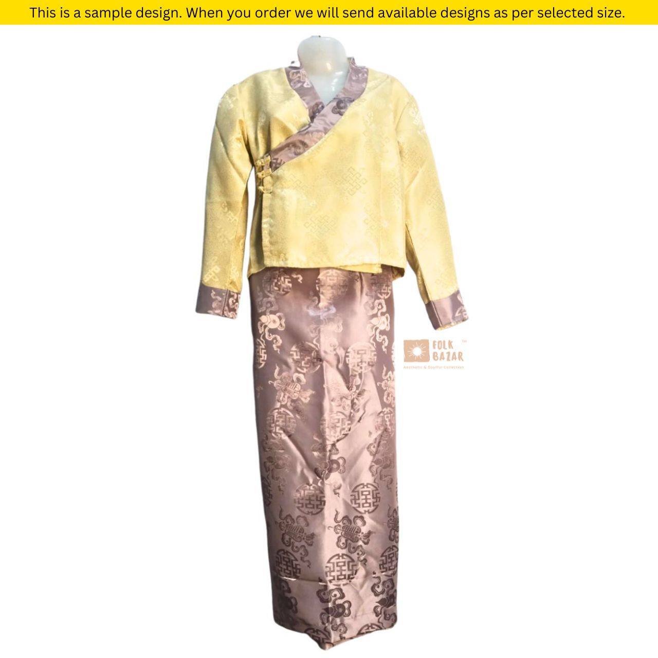 Experience the vibrant culture of the Tamang people through their exquisite traditional attire. Ladies Tamang dress made with high quality brocade and sewed with perfection. Bright color perfect to get sunkissed and click beautiful photos. Comes with a lower wrapon & upper Khenja.