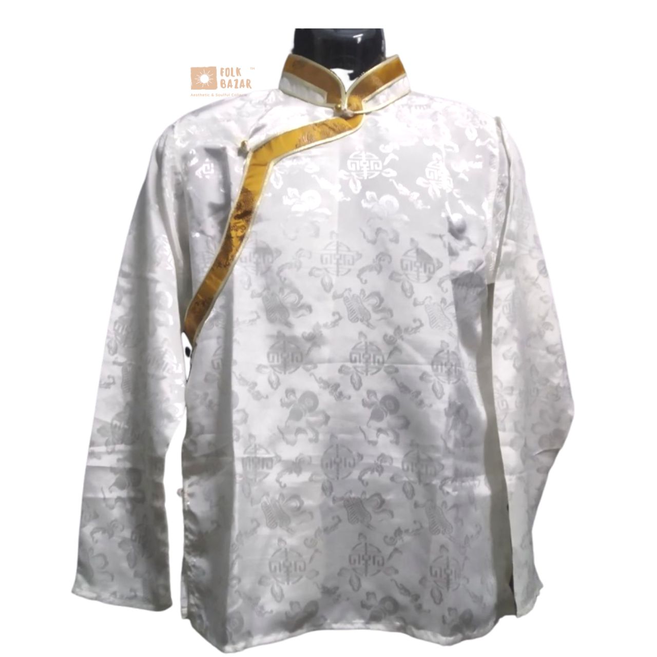 Effortlessly stylish, this White Khenja Shirt is a wardrobe must for any ethnic or casual outing. Crafted using lightweight synthetic fabric, it ensures all-day comfort. The crisp white colour has Kuchin border which adds elegance and can be paired with jeans for a modern look or a traditional coat for a more cultural style.