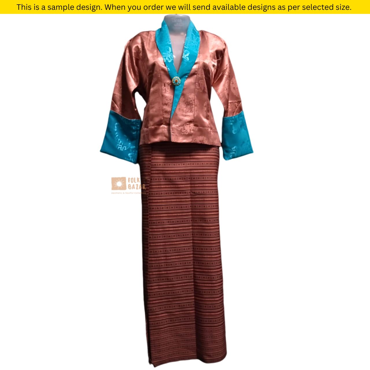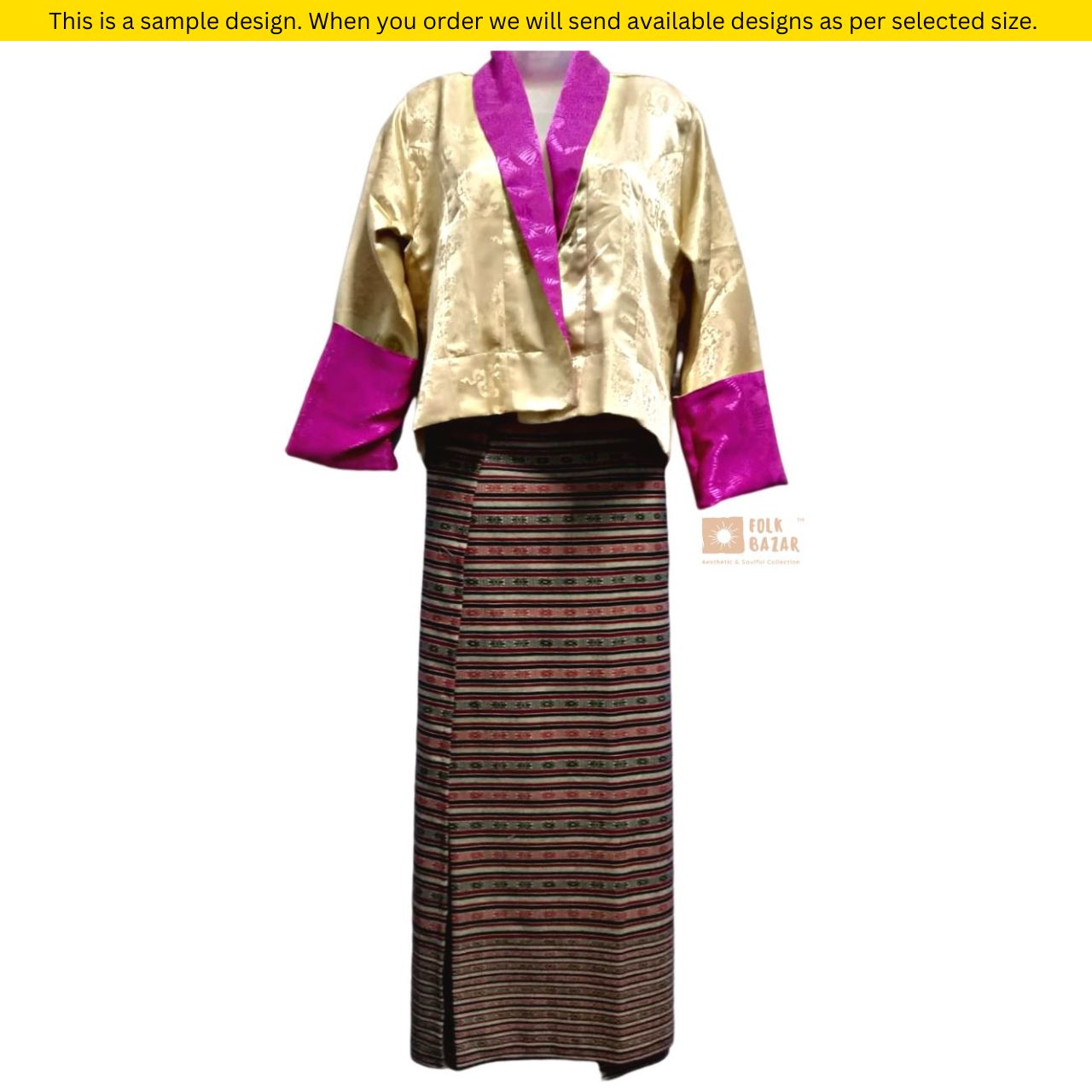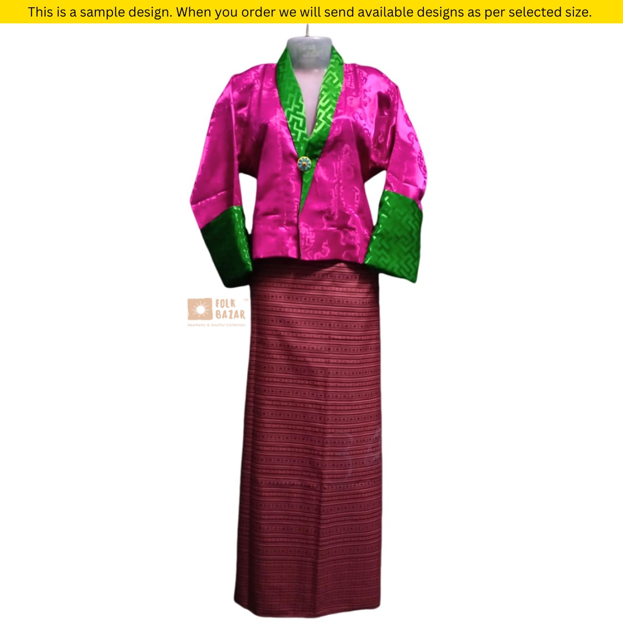 Discover the Kira Ladies Dress: national dress for women in Bhutan. Crafted from rich, durable fabric (Jacquard (Upper), Dobby (Lower).The dress comes in many sizes with a Toeg Coat with attached Wonju (upper) and Kira (Lower). This outfit is perfect for weddings, rituals, or community events.