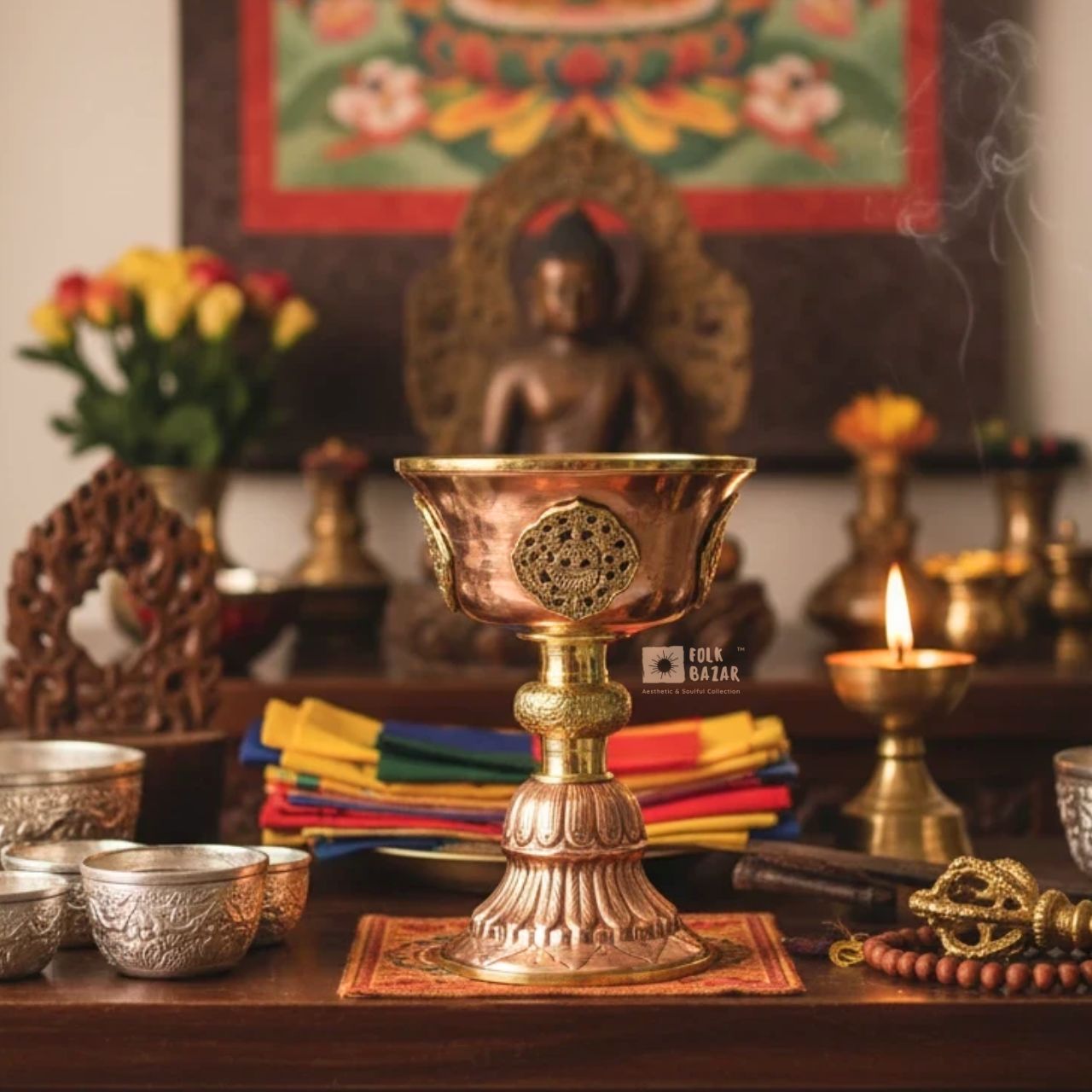 Butter Lamps are a common feature of Tibetan Buddhist temples & monasteries throughout the Himalayas. It is often placed on altars during prayers, meditation, & ceremonies. Lighting the lamp is an offering, representing a wish for clarity & enlightenment. To use, fill the lamp with butter or ghee and place a cotton wick in the center. This butter lamp is perfect for personal altars or as a thoughtful gift for someone seeking calm & inspiration.