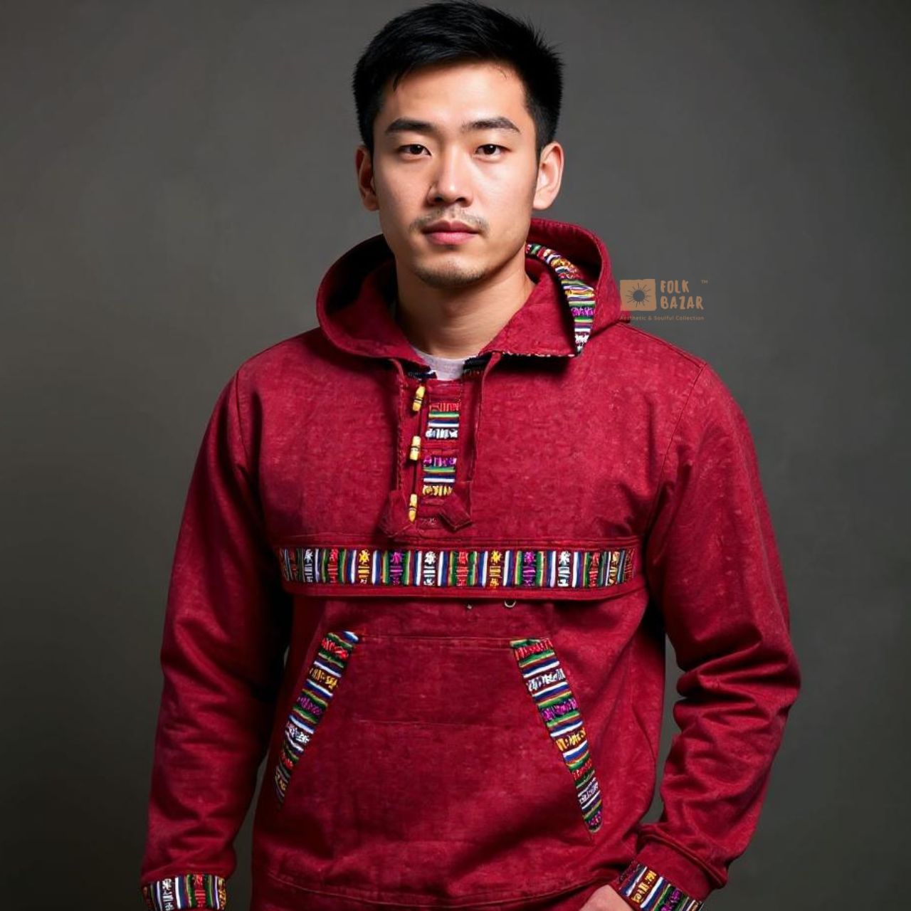 This Maroon Unisex Cotton Hoodie features a solid style with unique border adding cultural elegance to your wardrobe. It provides comfort and warmth for any season. Available in 6 sizes (XS-XXL), this hoodie is long-lasting, easy to care for, and won’t lose its shape or color. For an impressive look, wear this hoodie with jeans and canvas shoes.
