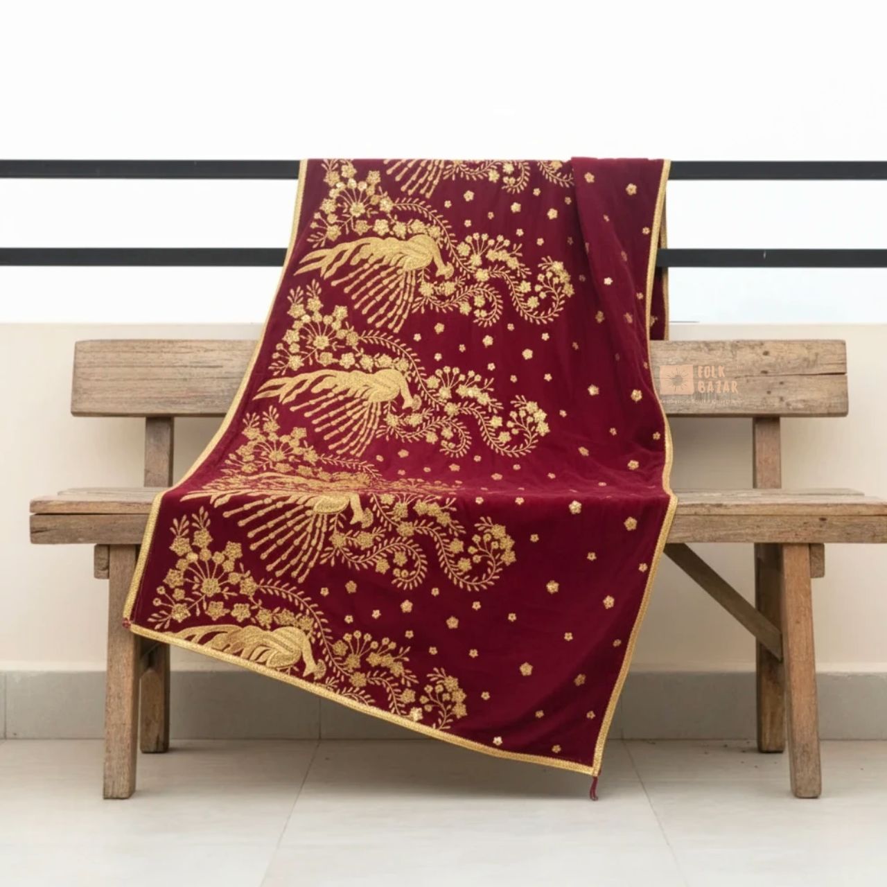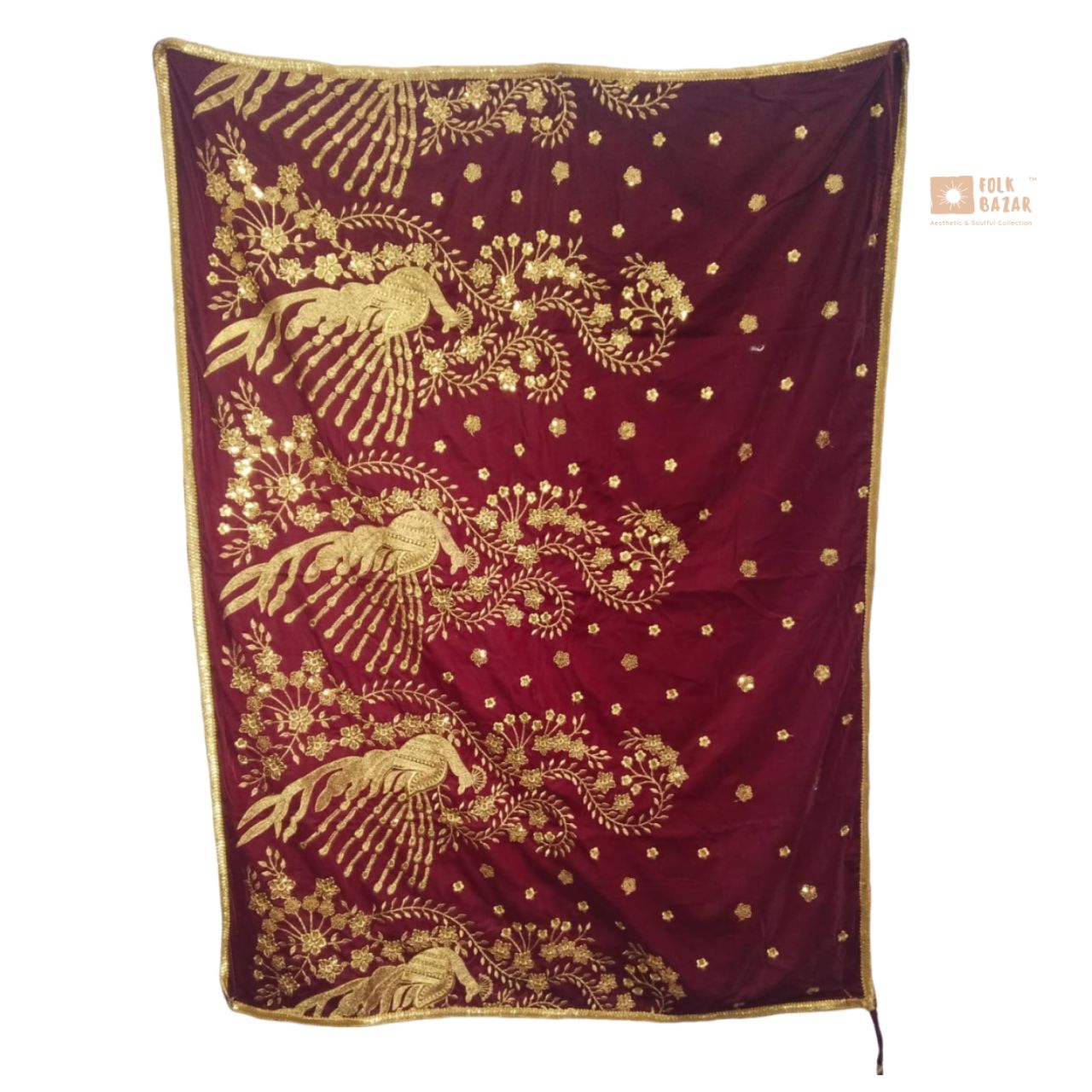 Add a regal touch to your wardrobe with this velvet Maroon Ghalek with beautifully embroidered peacocks in gold. Its rich colour and classic patterns make it ideal for ceremonies or cultural events. Pair it with cholo,blouse and statement jewellery for an elegant look
