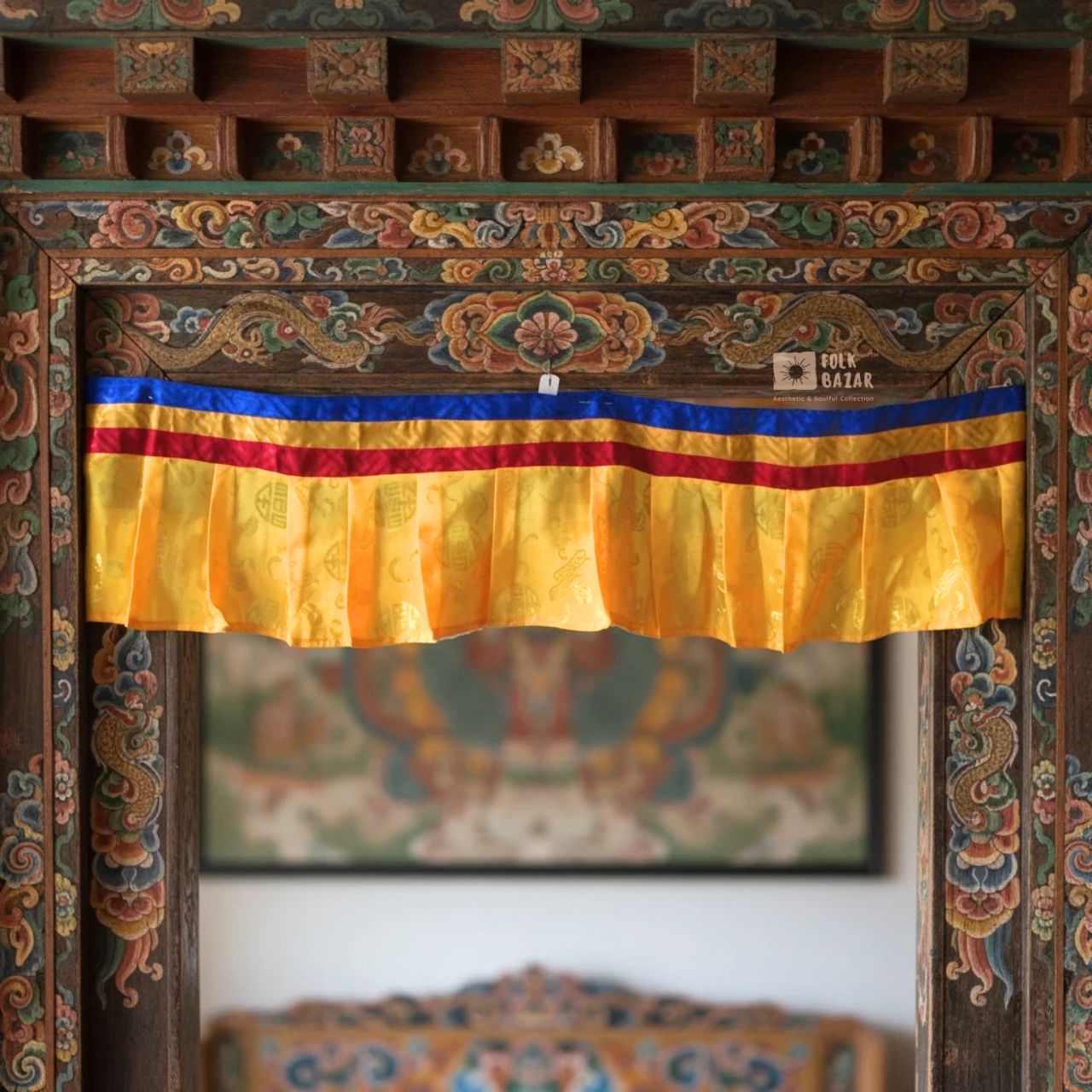 Simple yet vibrant, the Orangish Yellow Shamboo with Red and Blue Stripes is perfect for traditional homes. The contrasting stripes of red and blue add a dynamic touch to the bright yellow base, bringing a festive vibe to your entrance. Hang this classic Shamboo on your doorway to symbolize good fortune and invite auspicious energies into your space.
