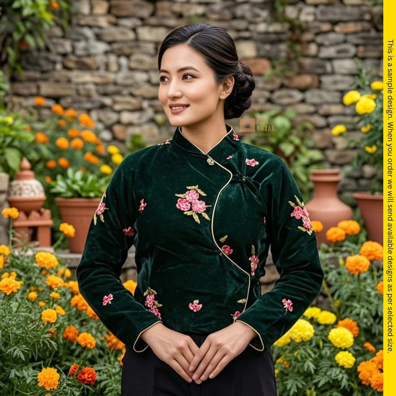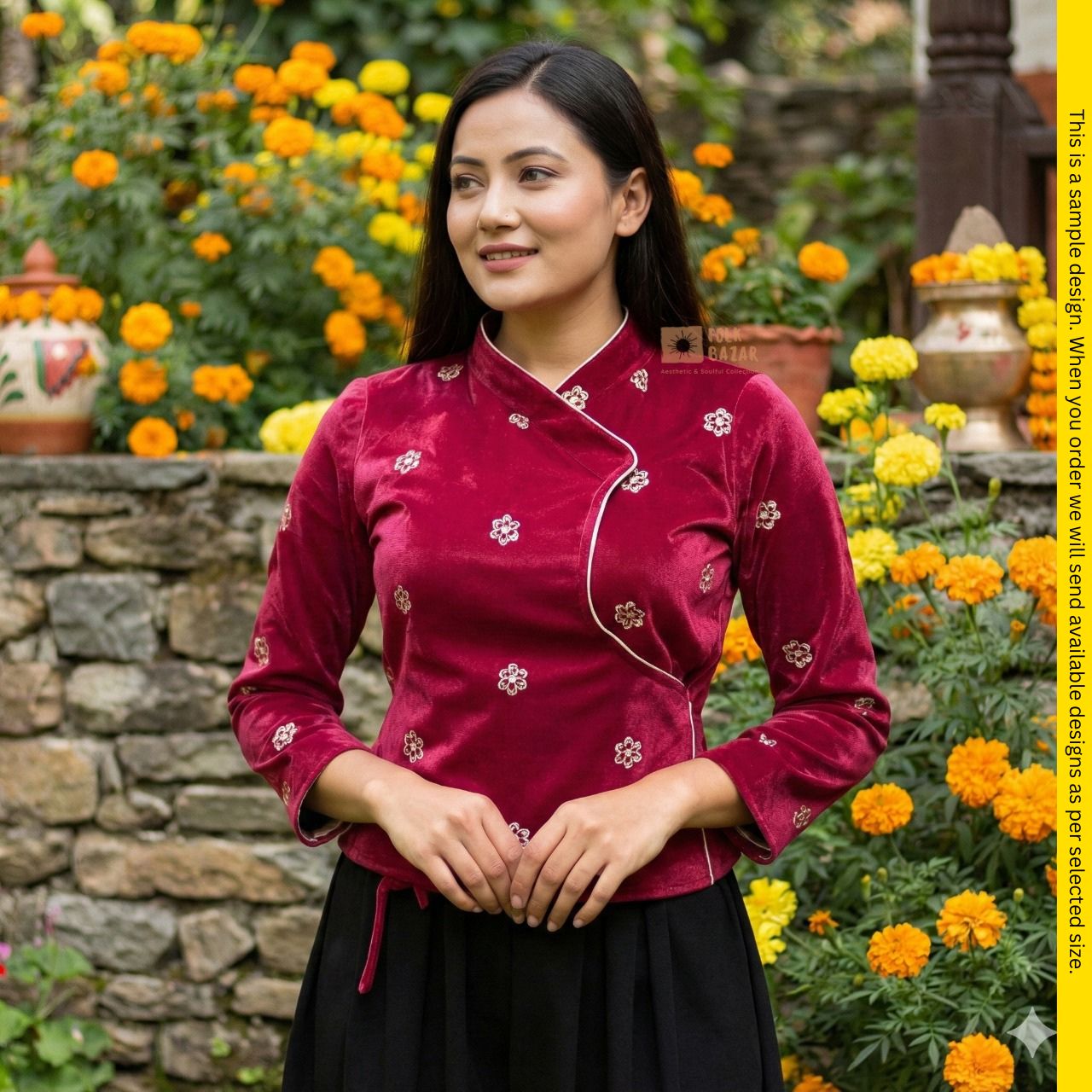 The Chaubandi Cholo is a staple for any Nepali wardrobe. Made from soft, durable cotton, its fitted design and vibrant floral patterns make it a versatile piece for everyday wear or festive occasions. Pair it with a matching saree or skirt, and add bangles or earrings for a complete look that’s equal parts comfortable and stylish.