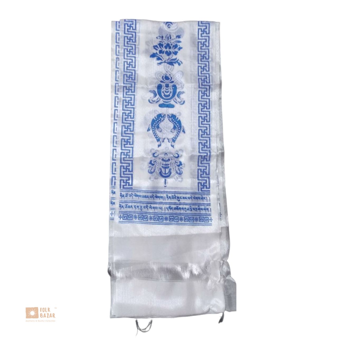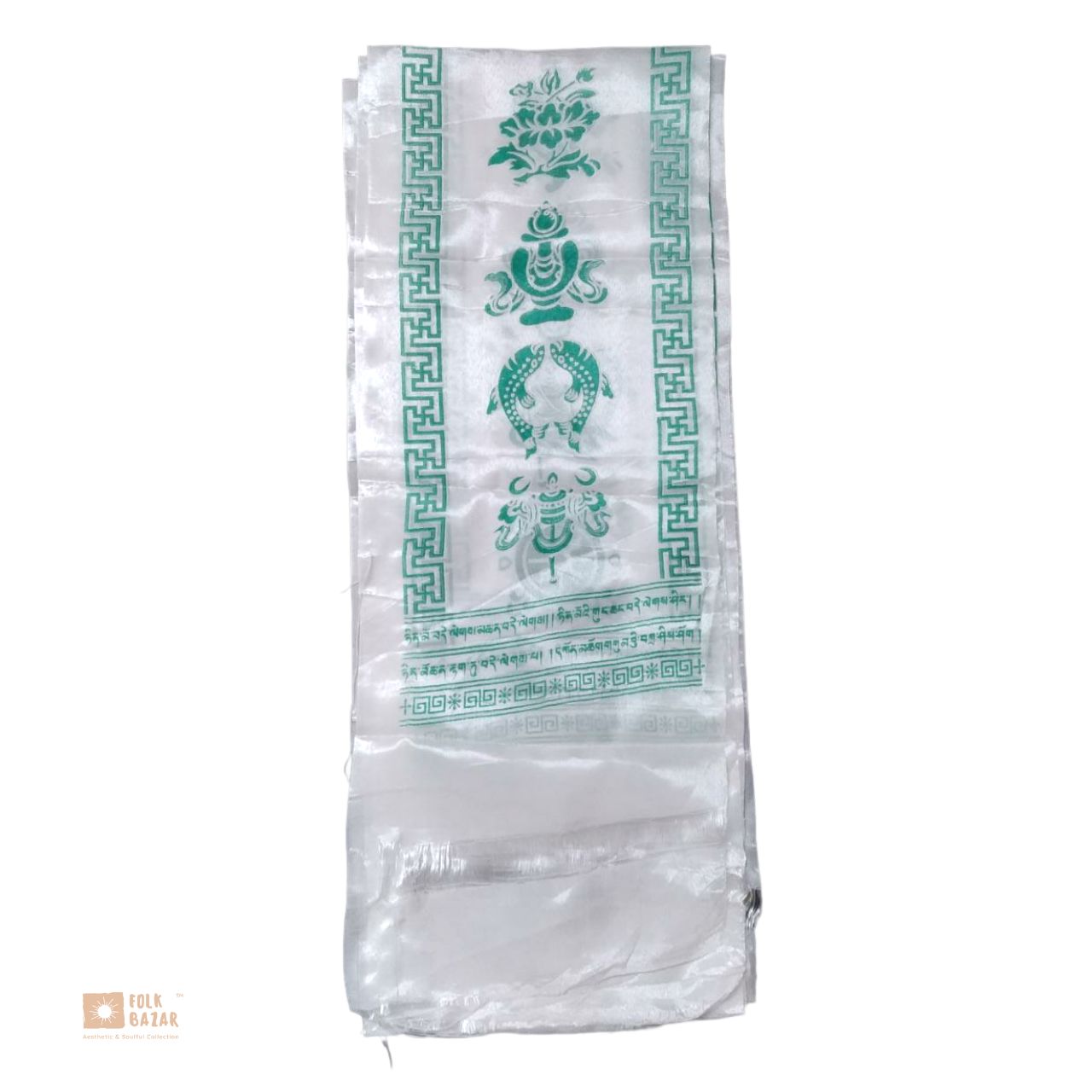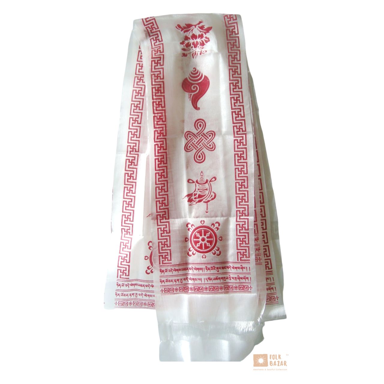 Enhance your spiritual practices with our beautiful Polyester Khadag Scarves, each about 1.5 meters by 12 inches in size. These scarves feature vibrant red, orange, blue, and green designs on a white background, decorated with the sacred 8 Lucky Signs, representing compassion, energy, wisdom, and harmony. This set of 4 scarves in 1 Bapcha is ideal for ceremonies, gifts, or bringing tradition to any occasion. Add color and meaning to your rituals—order your Khadag set today!