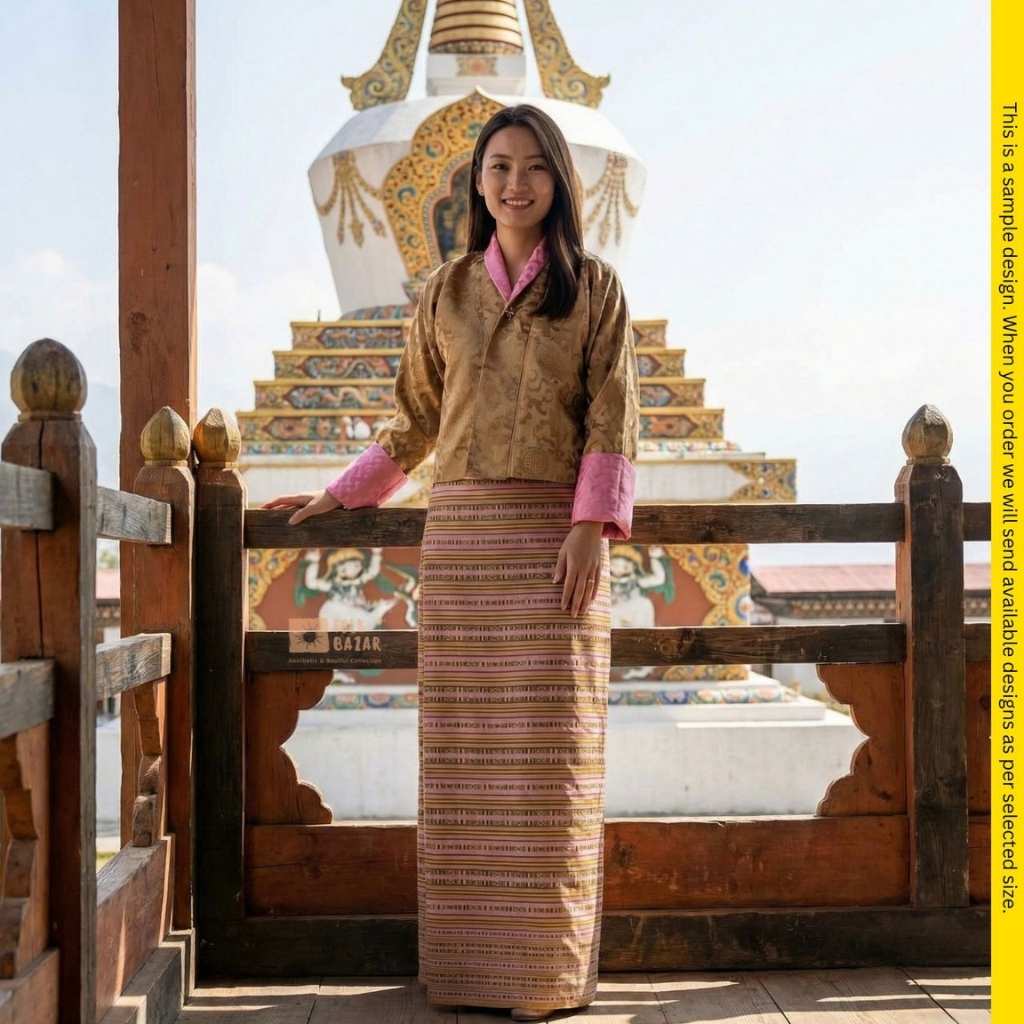 Discover the Kira Ladies Dress: national dress for women in Bhutan. Crafted from rich, durable fabric (Jacquard (Upper), Dobby (Lower).The dress comes in many sizes with a Toeg Coat with attached Wonju (upper) and Kira (Lower). This outfit is perfect for weddings, rituals, or community events.