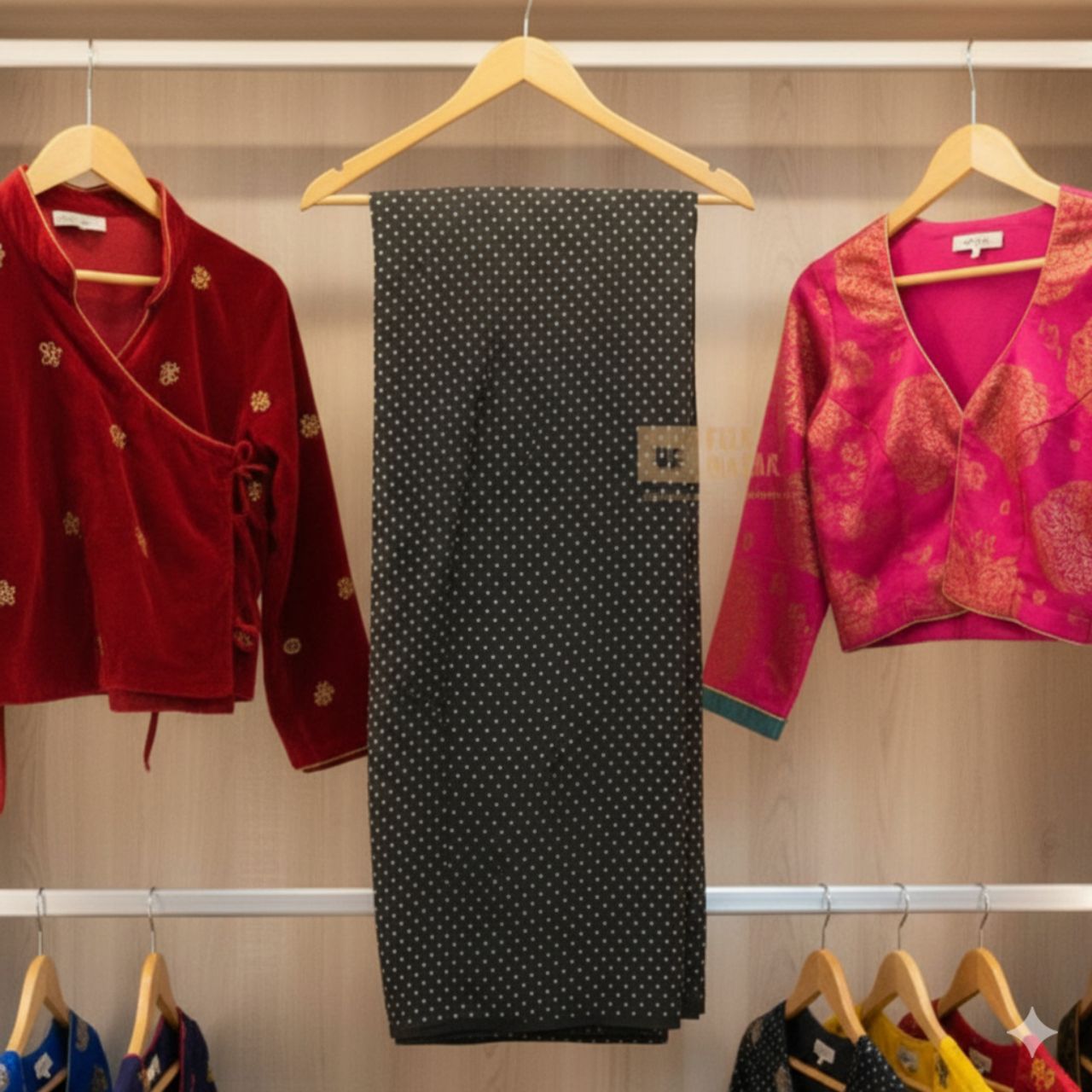 Step into sophistication with this Rai Saree, featuring polka dot patterns and deep hues of black. Its breathable synthetic ensures a comfortable fit, while the striking design adds a sense of drama to your look. Ideal for cultural events or semi-formal gatherings, this saree pairs best with statement necklaces and open-toe sandals for a chic, modern touch.
