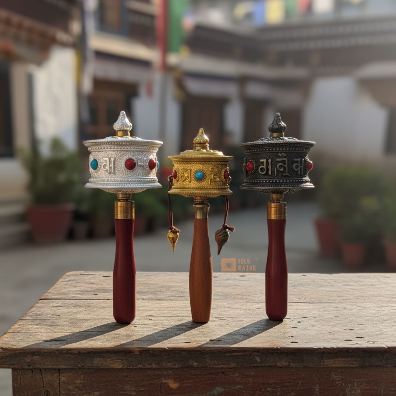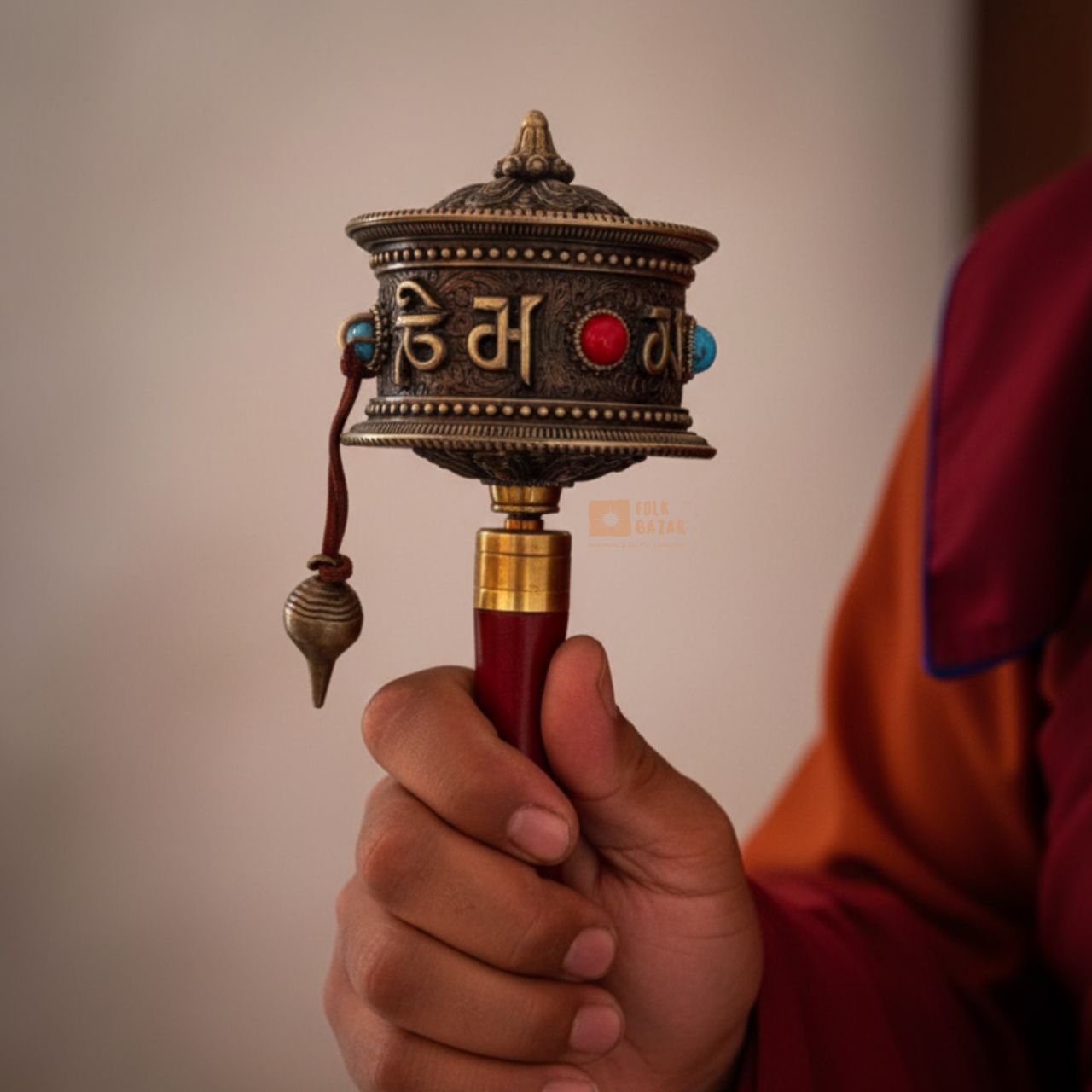 The 'Hand Mane' prayer wheel, represents the eight auspicious symbols (Ashtanga) that signify positive karma and perfect living. Rotating the wheel or saying the mantras provides blessings and spiritual peace of mind. It comes in medium and large sizes and will make an impressive and valuable addition to your spiritual practice and collection. Also, it can be gifted to anyone seeking inner peace and harmony.