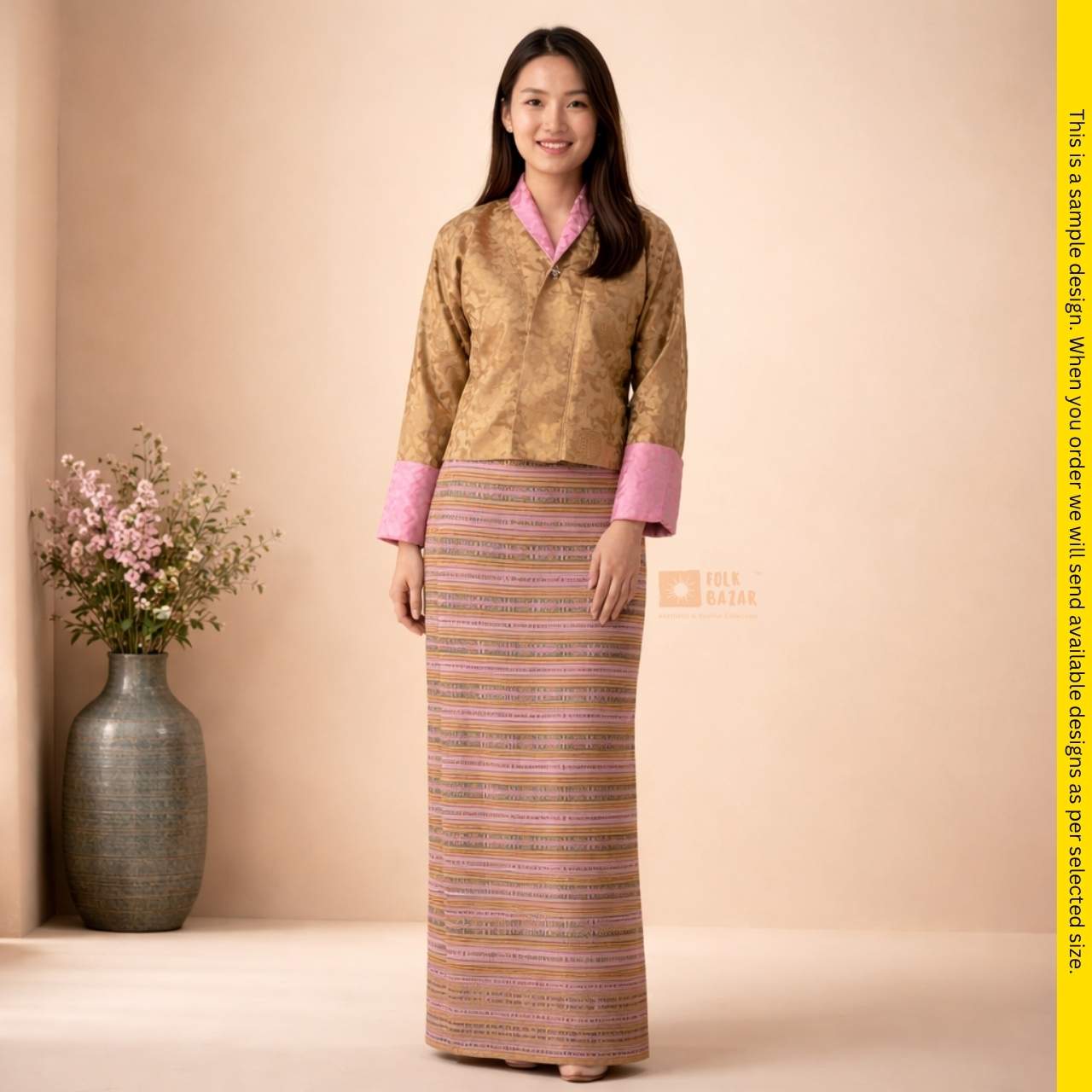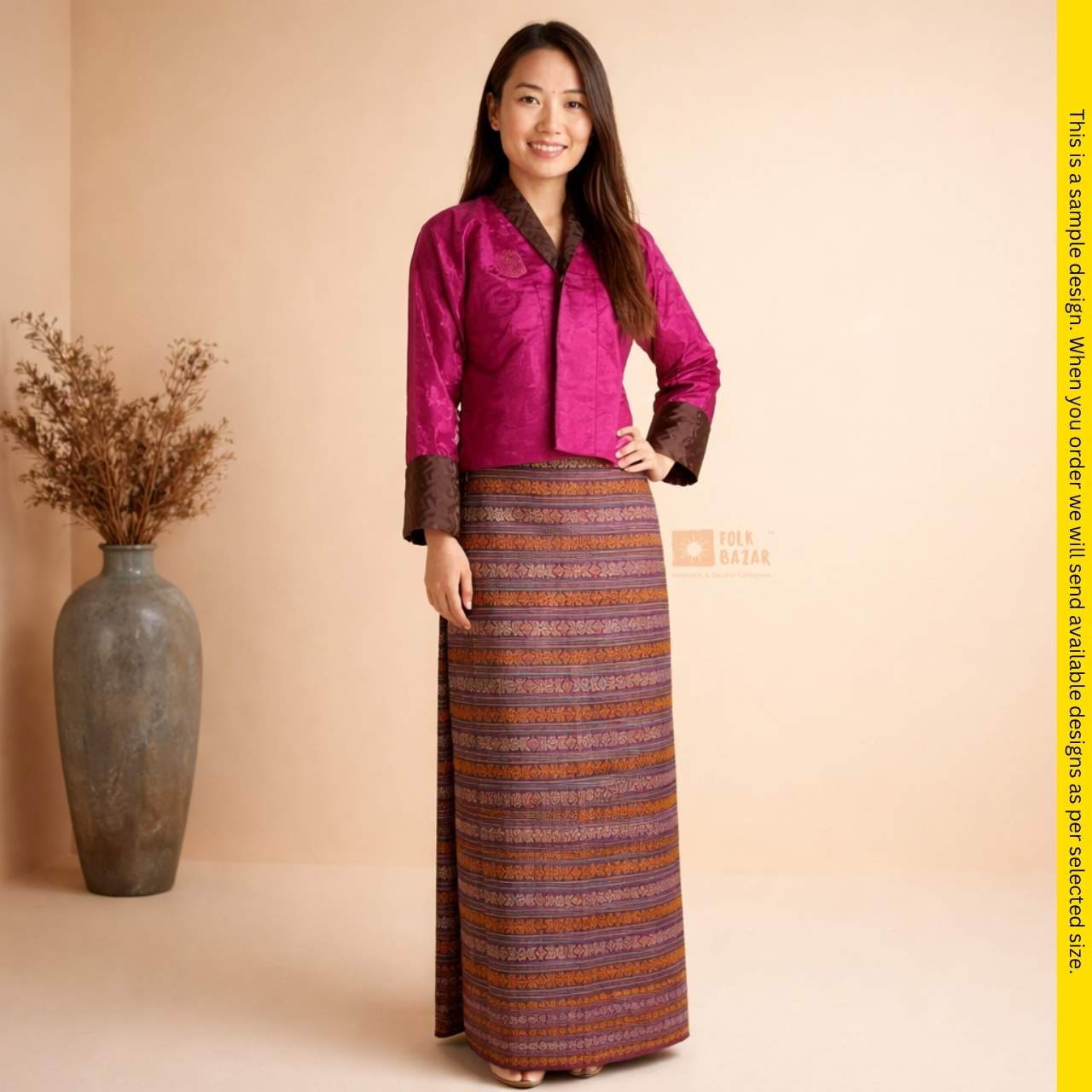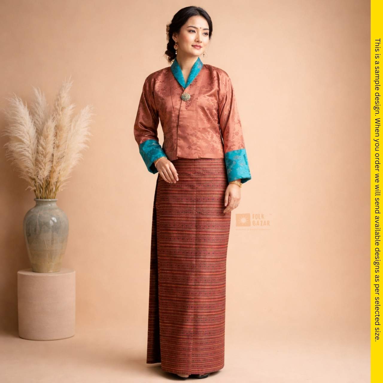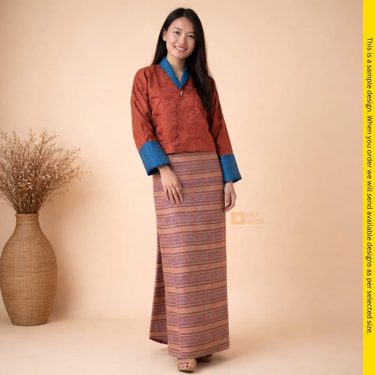 Discover the Kira Ladies Dress: national dress for women in Bhutan. Crafted from rich, durable fabric (Jacquard (Upper), Dobby (Lower).The dress comes in many sizes with a Toeg Coat with attached Wonju (upper) and Kira (Lower). This outfit is perfect for weddings, rituals, or community events.