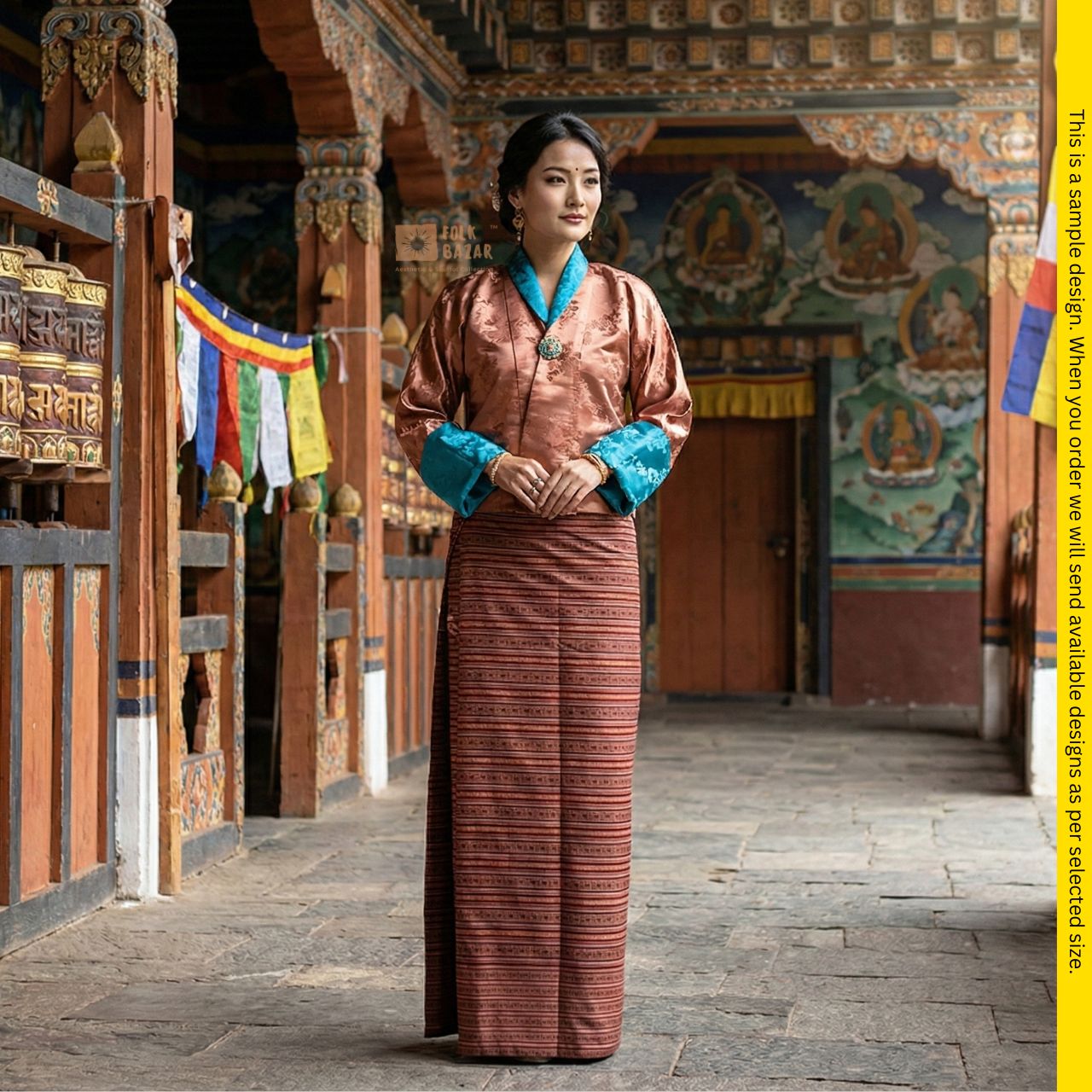 Discover the Kira Ladies Dress: national dress for women in Bhutan. Crafted from rich, durable fabric (Jacquard (Upper), Dobby (Lower).The dress comes in many sizes with a Toeg Coat with attached Wonju (upper) and Kira (Lower). This outfit is perfect for weddings, rituals, or community events.